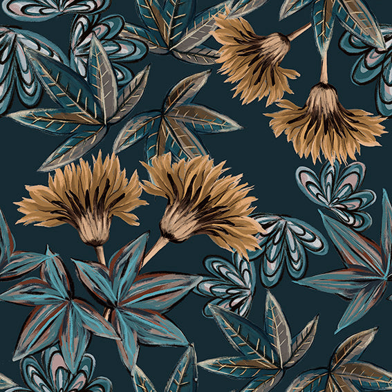 A dark blue botanical floral wallpaper transforms a wall into an artistic scene, adding depth, warmth and refined elegance to the space. Gold-ocher and bronze details along with blue-green leaves create visual layering and an intimate atmosphere, ideal for an accent wall .